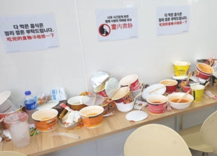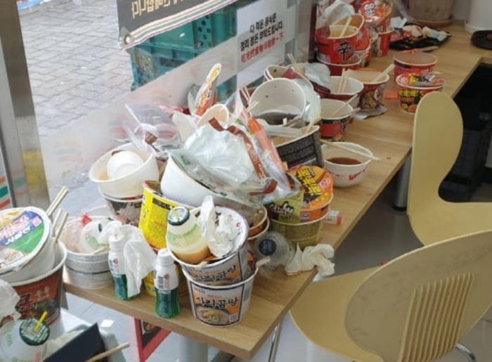 다수의 온라인 커뮤니티에 올라온 중국인 관광객의 편의점 쓰레기 방치 모습. 중국인 관광객이 자주 찾는 제주의 한 편의점에 먹고 남은 컵라면과 음료병 등 각종 쓰레기가 편의점 곳곳에 어지럽게 널려있는 사진이 온라인상에 공개돼 공분을 사고 있다.