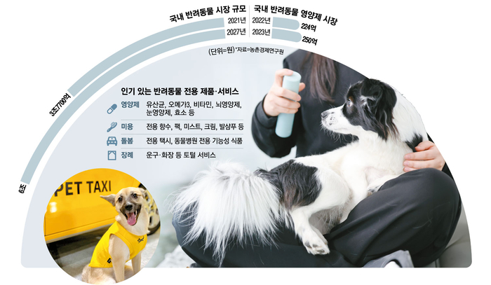 반려동물 양육인 1500만 시대에 화장품과 영양제는 더이상 사람만을 위한 제품이 아니다. 개·고양이를 자식처럼 돌보는 인구가 많아지면서 이들의 피부 미용을 위한 전용 화장품과 속 건강을 지키는 영양제가 인기를 끌고 있다. 주인 없이도 반려동물을 태워 목적지로 데려다 주는 반려동물 전용 택시 서비스도 활성화 중이다.