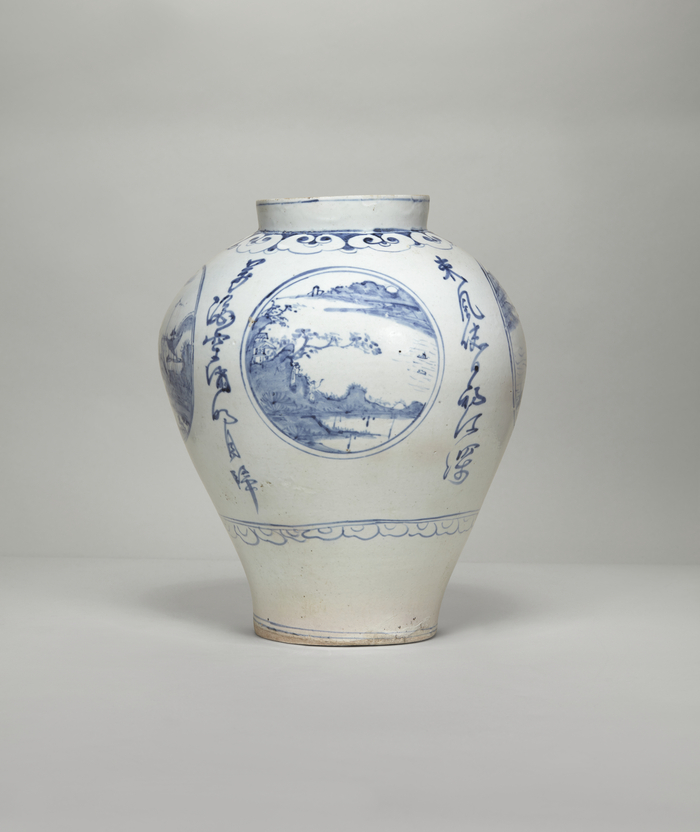 측면 네 곳에 동그란 원형의 창을 내어 그 안에는 소상팔경 중 네 장면을 그렸다. 각각의 원형 창 사이에는 다음과 같은 시문이 적혀 있다: ‘萬隱空満明月歸’; ‘來風使人釣江深’; ‘萬川向流陶人歌’; ‘長生不老神仙訓’. ‘허공에 숨은 달이 돌아오네; 불어오는 바람은 깊은 강에서 낚시를 하게 하네; 수만 개의 시냇물 줄기는 도공의 노래를 싣고 흐르네; 불멸의 가르침은 영생을 말하네’라는 내용의 시로,아름다운 산수도와 조화를 이룬다.