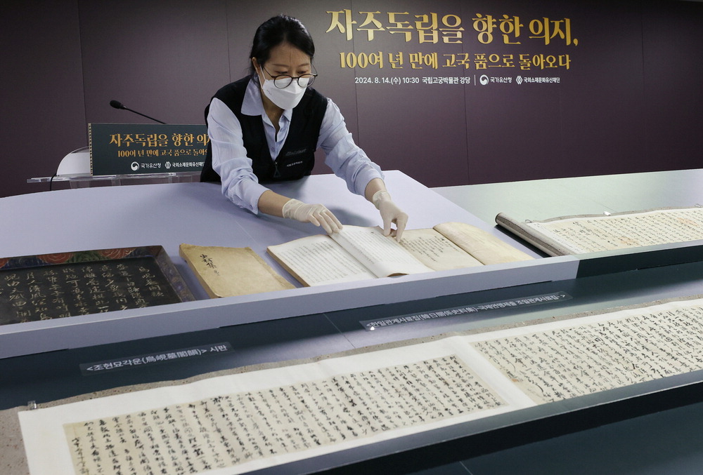 14일 서울 종로구 국립고궁박물관에서 열린 환수 문화유산 공개 행사에서 관계자가 '한일관계사료집' 및 '한말 의병 관련 문서' 두루마리,'조현묘각운 시판'을 공개하고 있다. 연합뉴스