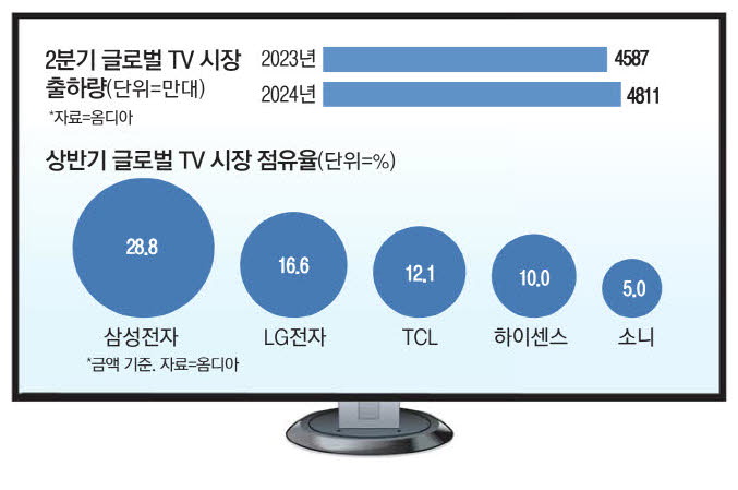 19일 글로벌 시장조사기관 옴디아에 따르면 올 2분기 전 세계 TV 출하량은 4811만대로,전년 동기(4587만대) 대비 약 4% 증가했다. 올림픽이라는 대형 스포츠 이벤트로 발생한 TV 교체 수요가 판매로 이어졌다는 분석이다. 삼성전자는 올 상반기 금액 기준 점유율이 28.8%,LG전자는 16.6%를 기록해 각각 1위와 2위에 올랐다. 합산 점유율은 45.4%로 전체 시장 수요의 절반가량을 차지했다.