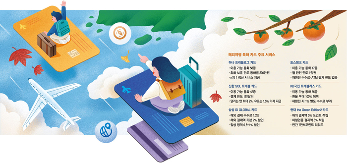 예컨대 신한은행은 ‘SOL트래블 신용카드’를 지난 7월 새로 출시했다. 연회비는 2만7000원~3만원으로 해외 이용금액 0.5% 마이신한포인트 적립,국내 이용금액 기본 0.5% 마이신한포인트 적립에 여행·교통·쇼핑·맛집·운동 영역 추가 1.5% 마이신한포인트 적립 혜택 등이 주어진다.