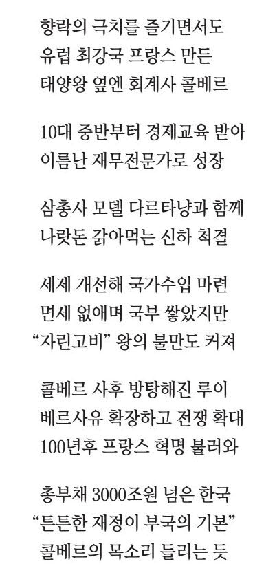 2024년 8월 대한민국과 가계 채무가 합계 3000조원을 넘었다는 뉴스를 보면서,저는 콜베르를 떠올렸습니다. 재정의 튼튼함이 부국의 기본이라고 태양왕 앞에서 설파하는 그의 모습을. 방만한 재정의 위대한 반대자를.