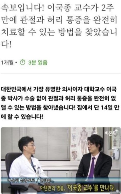 이국종 교수 등 유명 의사의 인터뷰 화면을 짜깁기해 만든 치료제 모바일 광고 [사진 = 광고 갈무리] 유명 의사를 사칭해 관절염 치료제를 광고하는 해외 쇼핑몰 관련 피해가 늘고 있어 소비자들의 주의가 필요해 보인다.
