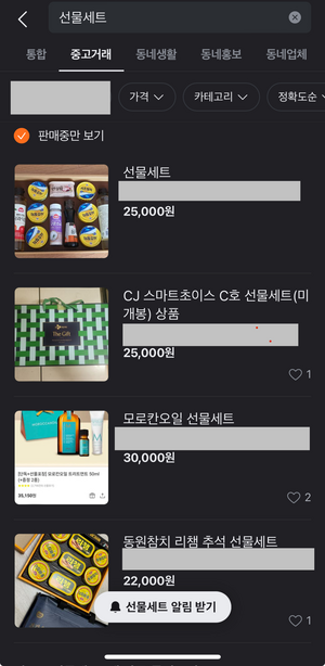 15일 당근에 ‘선물세트’로 검색했더니 계속해서 시간당 수십개의 상품이 올라오는 것을 볼 수 있었다. [당근] 선물 되팔기가 활성화한 이유는 중고거래 플랫폼 사용자 증가와 관련 있다.