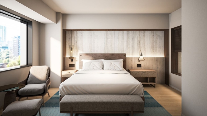 슈페리어 킹 룸 객실 내부 / 사진=메리어트 객실에 들어서면 홋카이도 숲속에 온 듯한 느낌을 받게 된다. 자작나무에서 영감을 받은 벽지가 객실을 따스하게 감싼다. 발밑에는 홋카이도 전통 염색 기법인 타데아이(Tadeai,蓼藍)를 연상시키는 러그 매트가 깔려있다.