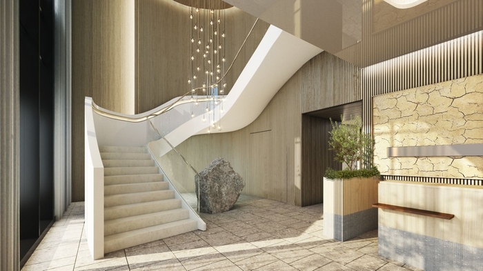 부드러운 곡선의 나선형 계단 / 사진=메리어트 공용 공간으로 나오면 더 재밌어진다. 부드러운 곡선의 나선형 계단은 완만한 언덕을 오르는 듯한 느낌을 준다. 그 위로 고드름을 닮은 샹들리에가 매달려 있는데,홋카이도 겨울을 상징적으로 표현했다. 아래에는 삿포로 연질석으로 만든 조각상이 있다. 고드름에서 떨어지는 물방울을 형상화했다.