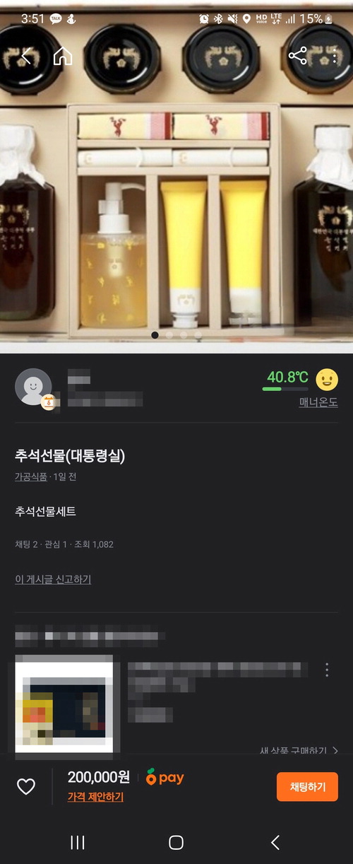 15일 당근 번개장터 중고나라 등 국내 주요 온라인 중고 플랫폼에는 다수의 추석 선물 세트가 올라왔다. 주요 검색어는 '선물 세트'와 '추석 선물' 등이며 샴푸,치약,레토르트 식품 등 명절 선물 세트 단골 상품을 구매할 수 있다. 포장도 뜯지 않은 새 상품을 보통 20~50%,크게는 70% 이상의 할인율을 적용해서 판매하는 이유로 많은 관심을 받는다. 생필품과 필수 식품을 사기 위해선 명절을 노려야 한다는 노하우가 공유될 정도다.