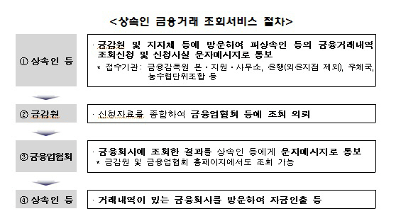 상속인이 금감원이나 시·군·구청·주민센터,은행,금융투자,생보,손보,카드,저축은행,농·수협 단위조합,신협,새마을금고,예탁결제원,우체국,예보,대부업,공무원연금공단,사립학교교직원연금공단 등의 접수처 중 한곳을 방문해 신청할 수 있다.