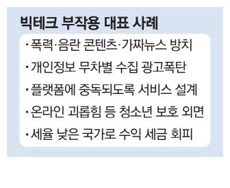 개인정보 보호 문제 외에도 빅테크의 횡포는 갈수록 커지고 있다. 독점 생태계 강화,폭력·음란 콘텐츠 및 가짜뉴스 방치,플랫폼에 중독되는 알고리즘,세율이 낮은 국가로의 세금 회피가 대표적이다.