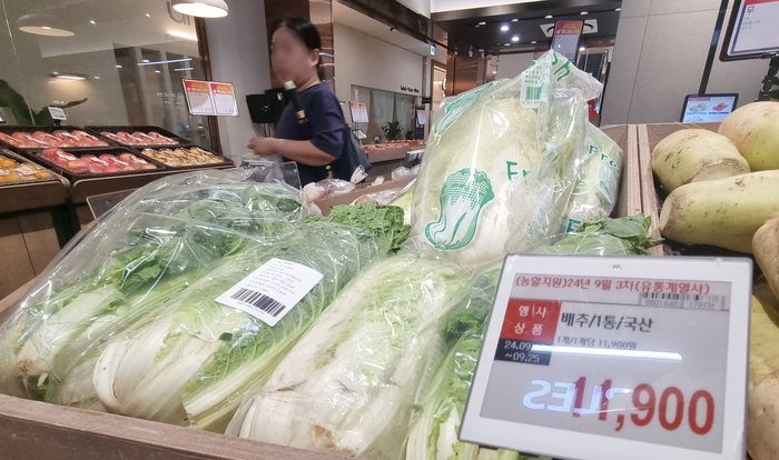 올여름 기록적인 폭염과 폭우 등으로 인해 여름 배추 가격이 폭등한 가운데 20일 서울의 한 대형마트에 김장용 배추가 한포기에 11,900원에 판매되고 있다. 2024.9.20 [이승환 기자] 한국농촌경제연구원도 가을배추 재배 의향 면적이 전년대비 2.1%,평년대비 4.3% 감소할 것으로 전망했다. 이에 따라 배추 도매가격은 10월 기준 전년 및 평년보다 상승할 것이라는 설명이다.