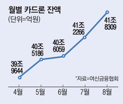 카드론 잔액은 지속적으로 증가하면서 사상 최고치를 매달 갈아치우고 있다. 여신금융협회에 따르면 9개 카드사(신한·삼성·현대·KB국민·롯데·우리·하나·BC·NH농협카드)의 8월말 기준 카드론 잔액은 41조 8309억원으로 전달 말 41조2266억원 대비 6043억원 늘어났다.