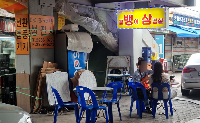 진영이네에서 연인들이 야장하는 모습 / 사진=김혜성 여행+ 기자 상가 곳곳에는 1984년 문을 연 낙지 곱창 새우 전골을 전문으로 하는 대성식당 등 노포 맛집이 가득하다. 특히 세운상가는 ‘야장’ 명소로 유명해졌다. 야장은 야외에 탁자를 깔고 식사하는 행위를 이른다.