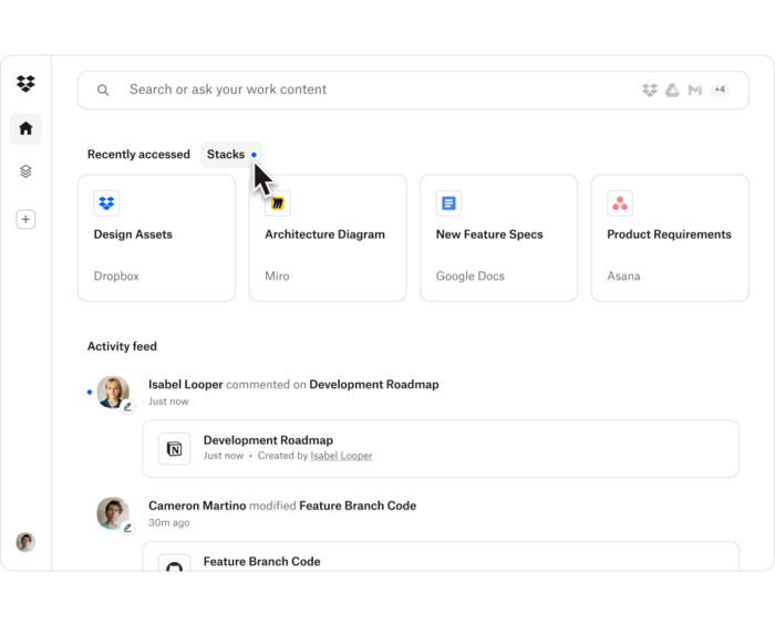 드롭박스 대시는 AI 기반의 범용 검색 기능으로 자료의 종류나 저장 위치에 상관없이 하나의 검색 창에서 원하는 자료를 찾을 수 있도록 돕는다. 구글 드라이브,원드라이브,노션,아사나 등과 같이 팀 또는 직장에서 사용하는 필수 툴과도 연동이 가능하다. 또한 머신 인텔리전스를 활용해 검색 결과를 개선하고 실시간 답변과 요약을 제공해준다.