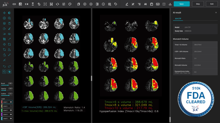 JLK-CTP는 뇌 CT 관류영상의 뇌혈류(CBF) 분석 결과를 기반으로 뇌경색 중심(Infarct core)과 뇌관류(Perfusion) 저하 영역의 부피를 자동 계산해 주는 솔루션이다.