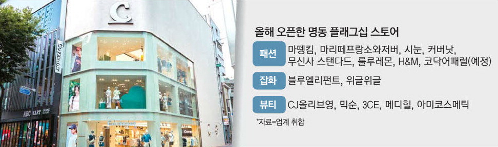 뷰티 브랜드 중에선 CJ올리브영과 믹순,3CE,메디힐이 새 매장을 냈으며 잡화 브랜드로는 위글위글과 블루엘리펀트가 명동에 자리를 잡았다. 이뿐만 아니라 MLB는 기존 명동 플래그십 스토어를 근처로 확장 이전했고,헤지스와 다이소는 매장을 재단장해 플래그십 스토어로서 기능을 한층 강화했다.