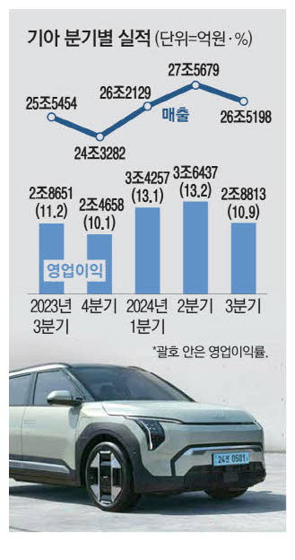 25일 기아는 올해 3분기 잠정 매출액 26조5198억원,영업이익 2조8813억원을 기록했다고 공시했다. 지난해 3분기 매출액(25조5454억원),영업이익(2조8651억원)과 비교하면 각각 3.8%,0.6% 상승한 수치다. 역대 3분기 실적만 따로 떼어놓고 보면 역대 최대 실적이다.