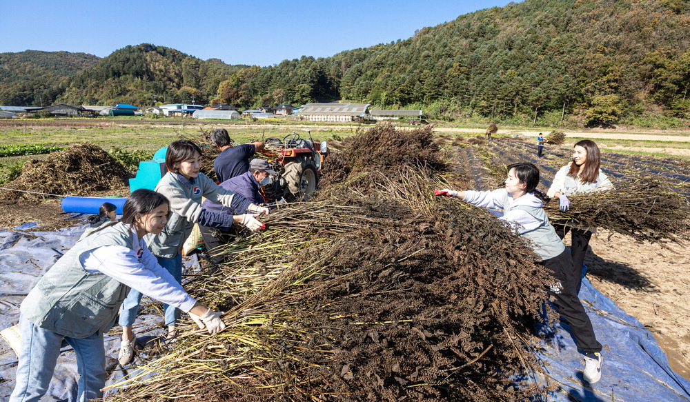 대한항공 임직원과 가족들이 지난 25일 '1사1촌' 자매결연을 맺은 강원도 홍천군 명동리 마을에서 가을맞이 농촌 일손돕기 봉사활동을 펼쳤다. 대한항공