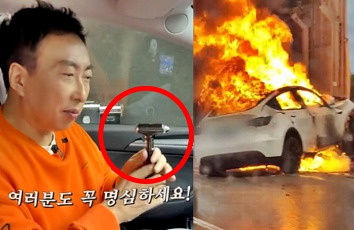 그는 마지막으로 준비해둔 게 있다며 쇠망치를 들면서 내연기관차이든 전기차이든 급박한 상황에서 유리를 깨고 탈출용으로 쓰기 위해 필요하다고 설명했다.