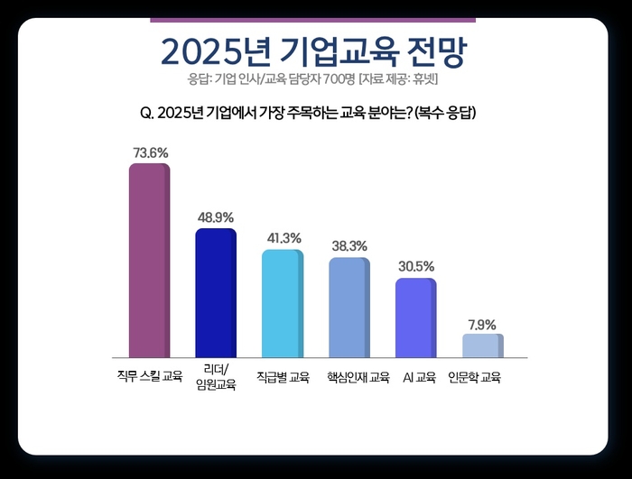 12일 휴넷이 기업의 인사·교육 담당자 700명을 대상으로 진행한 ‘2025 기업교육 전망’ 설문조사 결과에 따르면 내년 기업에서 가장 주목하는 교육 분야(복수 응답)는 ‘직무 스킬 교육’(73.6%)이 1위를 차지했다.