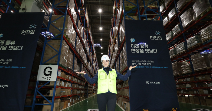 지난 13일 서울 가산동 한진 남서울종합물류터미널 기술 시연회에 참석한 조현민 한진 사장 <사진=한진> 지난 13일 서울 가산동 한진 남서울종합물류센터에서 떠오른 2대의 드론. 새로 개발한 재고 조사용 카메라가 탑재된 이 드론은 초속 30㎝로 창고를 누비며 100여개의 박스를 단 3분 만에 스캔했다. 지게차로 박스를 내려 사람이 수작업으로 바코드를 찍으면 1시간씩 걸리던 작업이다.