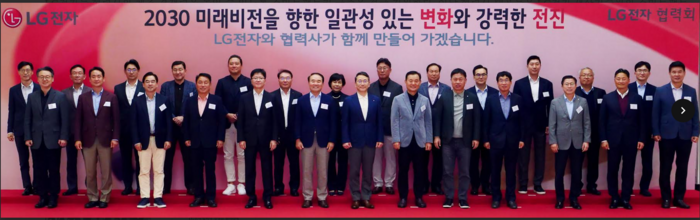 LG전자 경영진과 85개 협력사 대표들. (앞줄 왼쪽부터) 은석현 VS본부장,박영근 VS 협력회 회장,박형세 HE 본부장,이승원 HE/BS 협력회 회장,왕철민 글로벌오퍼레이션센터장,한동권 전사 협력회 회장,조주완 LG전자 CEO,정태영 전사 협력회 부회장,류재철 H&A 본부장,조영도 H&A 협력회 회장,장봉익 BS 본부장,최상기 전사 협력회 사무총장,정대화 생산기술원장 경영진·85개 협력사 대표 워크숍