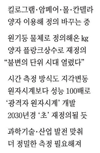 우리가 일상에 몰두해 있는 동안,질량 단위인 ㎏과 전류 단위인 암페어(A)의 정의가 조금씩 달라졌다. 과학자들이 모여서 질량과 시간의 측정법을 새롭게 적용하면서다. 1㎏은 아주 조금 가벼워졌고,이에 따라 물질의 양과 전류 단위도 미세 조정됐다. 초 단위 시간은 몇 년 내에 길거나 짧아질 전망이다. 인류가 '양자'라는 아주 작은 세계를 들여다볼 수 있게 되면서 생긴 변화들이다.