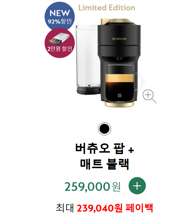 버츄오 팝 플러스 매트 블랙.[사진 제공 = 네스프레소 홈페이지 캡처] 네슬레 코리아의 또 다른 브랜드인 돌체구스토도 전용 머신(지니오S 베이직 캡슐 커피 머신)을 45% 할인한 8만9000원에 내놓는 등 맞불을 놓고 있다.