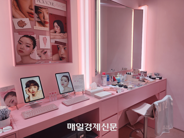 ‘올리브영N 성수’에 마련된 메이크업 스튜디오 모습. [사진=김금이 기자] “올리브영이 제안하는 트렌드 메이크업을 무료로 받을 수 있습니다. 성수동 분위기에 어울리는 ‘세미 스모키’ 눈화장 어떠신가요?”
