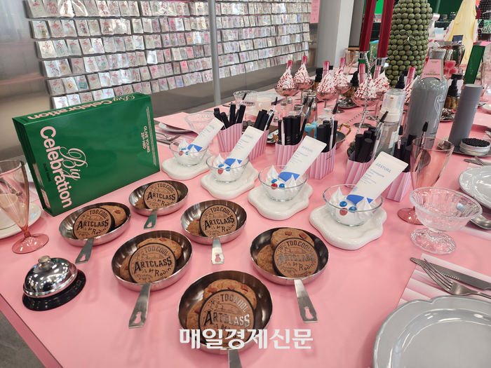 ‘올리브영N 성수’에 마련된 올영어워즈 제품 전시 모습. [사진=김금이 기자] 1층에 들어서자 올리브영 창립 25주년을 축하하는 생일 케이크와 디저트 모형들로 꾸며진 분홍색 ‘생일파티’ 테이블이 눈에 띄었다. 기존 매장과 같은 상품 매대는 줄어든 대신,테이블 곳곳 올영어워즈 수상 브랜드들이 전시됐다.