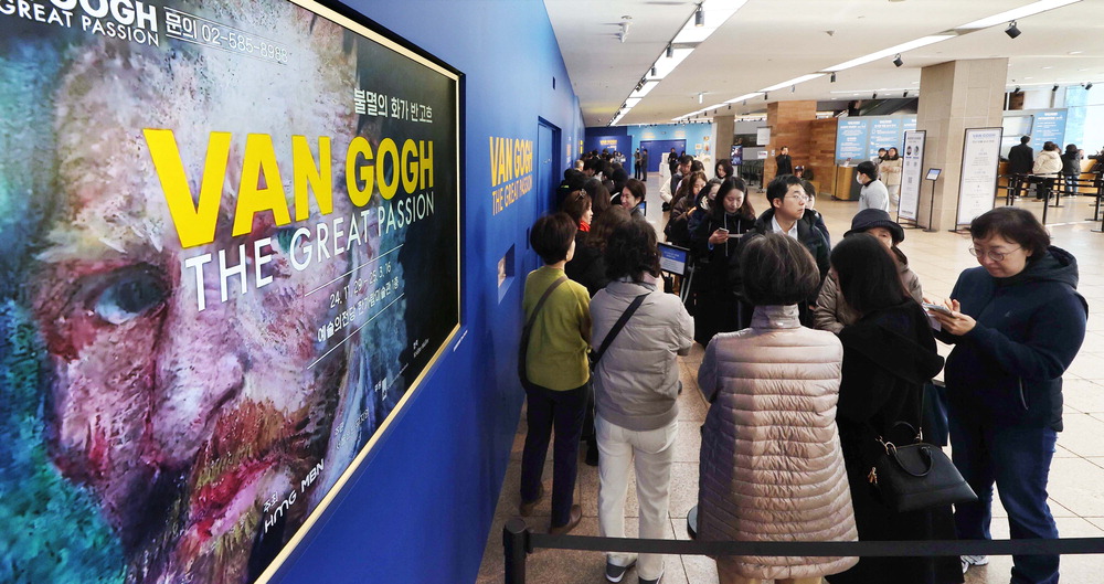 MBN과 HMG가 주최한 '불멸의 화가 반 고흐,THE GREAT PASSION' 전시 개막 첫날인 29일 서울 서초구 예술의전당 한가람미술관 입구가 입장을 기다리는 관람객들로 북적이고 있다. MBN 개국 30주년을 기념해 특별기획한 이번 전시는 반 고흐의 생애와 작품 세계를 조망하는 국내 최대 규모 회고전으로 35만장이 넘는 사전 티켓 판매 기록을 세웠다. 전시 작품의 총평가액만 1조원이 넘는다. 한주형 기자