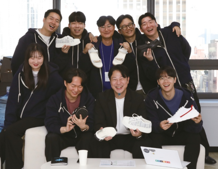 이민봉 크리스틴컴퍼니 대표(앞줄 가운데)가 직원들과 함께 자사 신발 제조 플랫폼 ‘신플’로 제작한 신발들을 들어보이고 있다. 사진제공=크리스틴컴퍼니