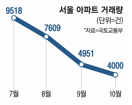 밑바닥 경기 지표 중 하나인 부동산 거래 시장도 얼어붙었다. 이날 국토교통부가 발표한 10월 주택통계에 따르면 지난달 서울 아파트 매매 거래량은 4000가구로 집계됐다. 전달(4951가구) 대비 19.2% 줄어든 수치다. 올해 4월(4840가구) 이후 6개월 만에 가장 적은 거래량이다.