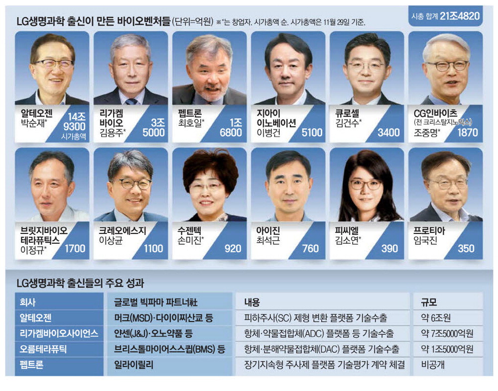 LG생명과학(현 LG화학)은 '대한민국 바이오 사관학교'로 불린다. 이 회사 연구소는 1980년대부터 아시아 최대 규모였고,당시 최고 인재였던 석박사 연구원들이 독립하면서 K제약바이오 산업을 키웠다. 이 회사 출신 바이오벤처 창업자만 30명이 넘고,대학교수는 170여 명에 달한다. 유망한 신약후보물질 발굴과 임상시험,상업화 단계까지 국내 생태계 전반에 LG 출신 전문가들이 두루 포진해 있다. 한때 삼성바이오로직스와 셀트리온 연구원 3명 중 1명은 LG OB들이라는 말이 있을 정도였다.