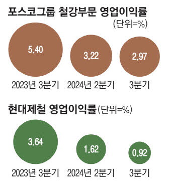 한국 철강산업을 이끄는 양대 제강사는 계절적 성수기인 지난 3분기에도 영업이익률 3%대를 넘기지 못했다. 포스코그룹 철강 부문은 지난해 3분기 5.4% 수준이었던 영업이익률이 올해 3분기엔 2.9%로 뚝 떨어졌다. 현대제철도 같은 기간 3.64%였던 영업이익률이 0.92%로 급락하며 역대 최저 수준의 수익성을 보이고 있다.