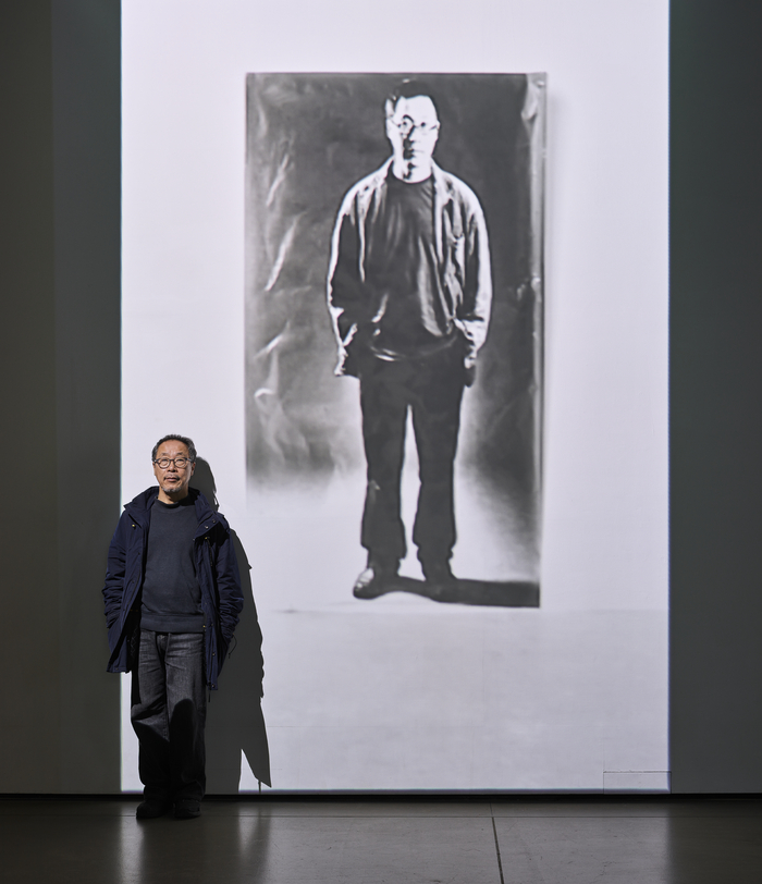 제16회 김종영 미술상 수상자로 서울 종로구 평창동 김종영미술관에서 수상 기념전을 진행 중인 김승영 작가가 1999년 영상 설치 작품 ‘자화상’에 기대 서 있다. 김용관