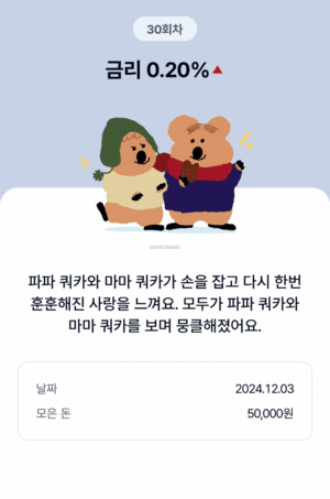 케이뱅크 궁금한적금의 쿼카 스토리. 케이뱅크는 궁금한적금을 카카오뱅크 한달적금처럼 상시 판매할 계획이며 지난 2일 금리를 연 7.2%로 소폭 조정했다. [케이뱅크 앱 캡처] 한달 입금 후 아메리카노 한 잔 값 벌어