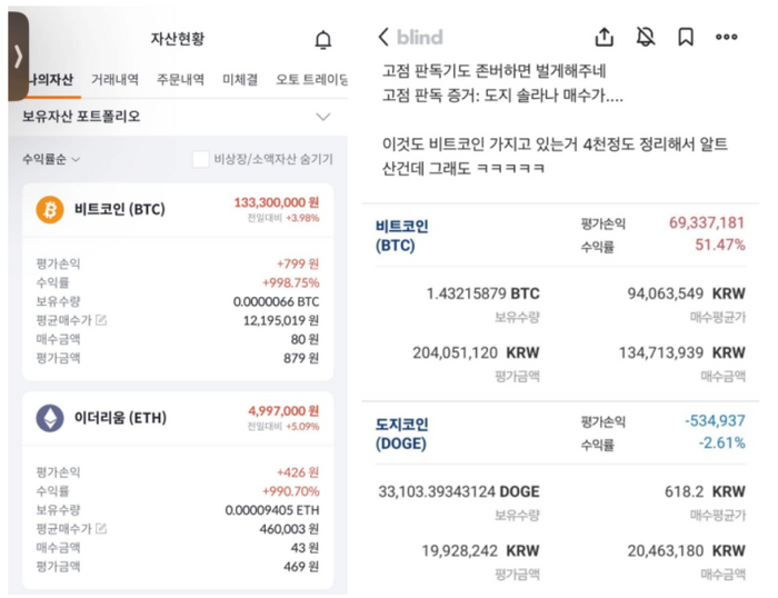 직장인 커뮤니티 블라인드에 올라온 수익 인증 사진에 따르면 글쓴이는 전날 비트코인 수익률 998.75%를 기록했다. 이더리움 수익률은 990.70%에 달한다.