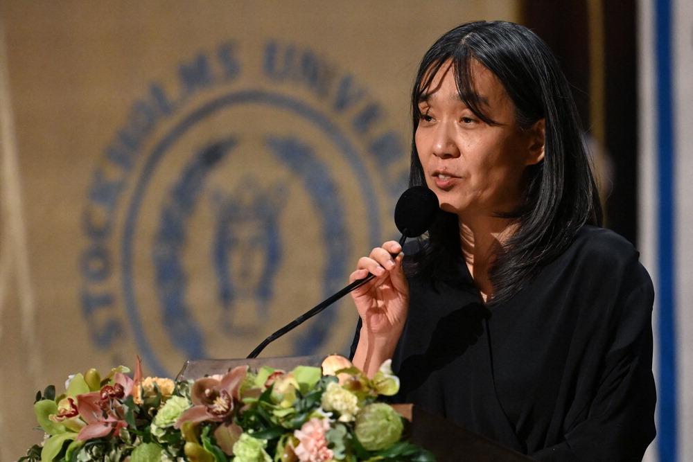 2024년 노벨문학상 수상자인 한강 작가가 10일(현지시간) 스웨덴 스톡홀름 시청에서 열린 연회에서 수상 소감을 밝히고 있다. AFP연합뉴스