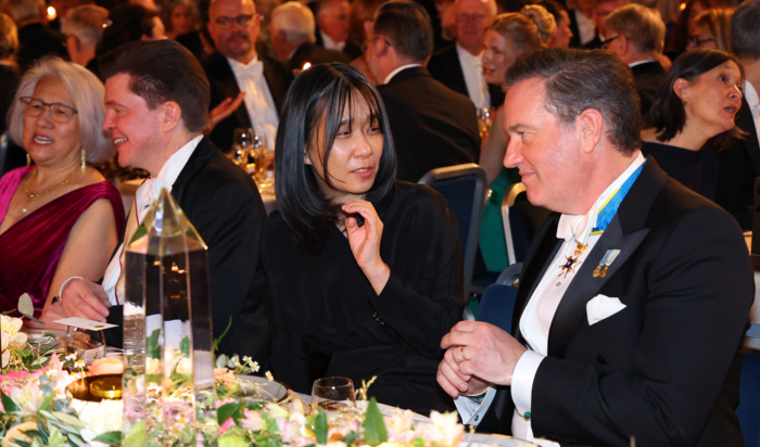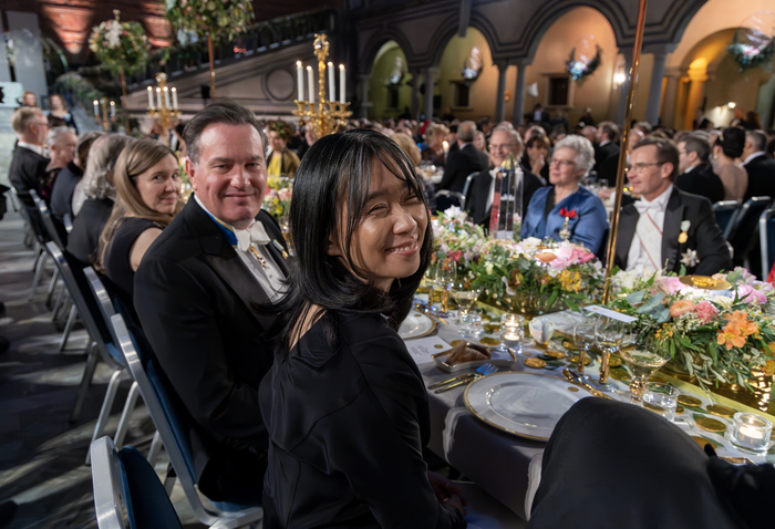 노벨상 124년 역사에서 몇 안 되는 여성 노벨문학상 수상자란 공통점과 ‘산 자와 죽은 자를 가로지르는 문학’이란 분모를 공유한 둘은 반갑게 인사했다. 만찬의 핵심 인물인 칼 구스타브 16세 국왕은 정중앙 좌석인 A-22에 앉아 한강 작가와는 다섯 자리 떨어져 있었다.