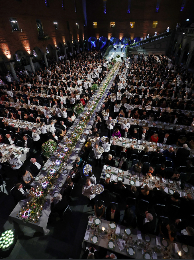 10일(현지시간) 스톡홀름시청에서 열린 ‘2024 노벨 만찬’ 모습. [연합뉴스] 총길이 25m,84명이 앉는 테이블A(헤드테이블)이 식장을 세로로 가로지른다. 다른 인원은 그 옆의 60여개 테이블에 앉게 된다.