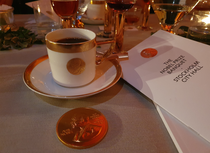 ‘2024 노벨 만찬’ 총 3코스 이후 제공된 커피. 식기 하나기 십수만 원에 달할 정도로 고가다. 모든 식기에 노벨 메달이 새겨지고나 글자로 ‘NOBEL’이라고 적혀 있다. 오른쪽 책자는 만찬 메뉴와 만찬 공연 정보가 담긴 책자. 아래 ‘노벨 초콜릿’은 노벨 메달과 같은 모양으로 제작된 스톡홀름의 인기 관광 상품이다. [김유태 기자] 서빙 직원들은 모두 스웨덴 대학생들이며,노벨 만찬 ‘아르바이트’는 그 자체로 권위가 높아 학생들도 경쟁률이 높다고 전해진다.