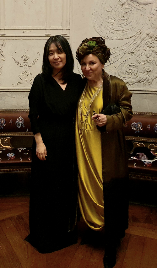 10일(현지시각) 스톡홀름시청에서 열린 ‘2024년 노벨 만찬’에서 2019년 노벨문학상 수상작가 올가 토카르추크와 만난 한강 작가. [김유태 기자] 2018 노벨문학상 토카르추크