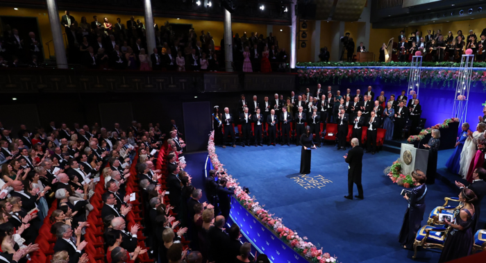 시상식 개회 1분 전,장내를 가득 메운 1500명 참석자는 침묵과 정적 속에서 2024년 노벨상 수상자들,칼 구스타프 16세를 비롯한 스웨덴 왕족들,그리고 귀빈 입장을 기다리던 중이었다.