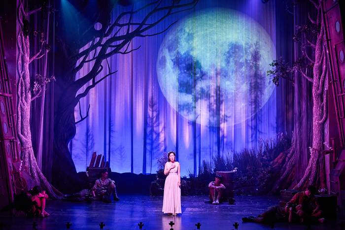 미디어아트의 다양한 색감과 오브제를 활용해 무대를 풍성하게 꾸몄다. 나뭇잎으로 만든 고깔모나 꽃가지 소품은 전쟁 속 희망을 상징한다. 내년 3월 3일까지 서울 대학로 인터파크 유니플렉스 1관.