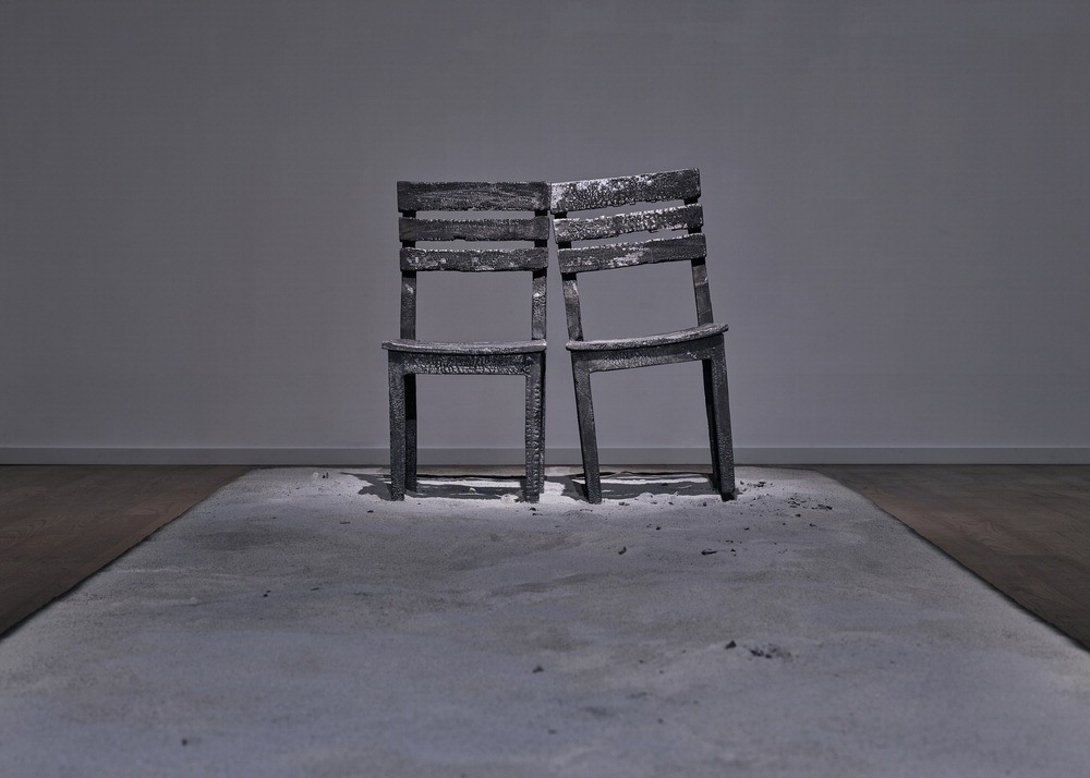 회백색의 잿더미 위에 불에 타 검게 그을려진 나무 의자 두 개가 나란히 놓여 있다. 한 의자는 굳게 세워져 있지만,옆의 또 다른 의자는 쓰러질 듯하면서 그 의자에 기대어 있다. 의자의 주인도 그랬을까. 설치미술가 김승영(61)의 '두 개의 의자'(2024)는 작가가 평생을 생계와 살림으로 고생스럽게 살다 가신 어머니에 대한 기억을 형상화한 작품이다. 김 작가는 "열여덟 살이라는 어린 나이에 가부장적인 아버지에게 시집을 가셔서 사는 동안 속이 많이 탔을 것 같았다. 하지만 그럼에도 불구하고 어머니는 아버지한테 항상 기대고 있는 느낌이었다"고 설명했다. 의자 아래 수북이 깔린 재는 얼마 전 세상을 떠난 어머니의 실제 유품들을 태우고 남은 재를 활용해 연출한 것이다.