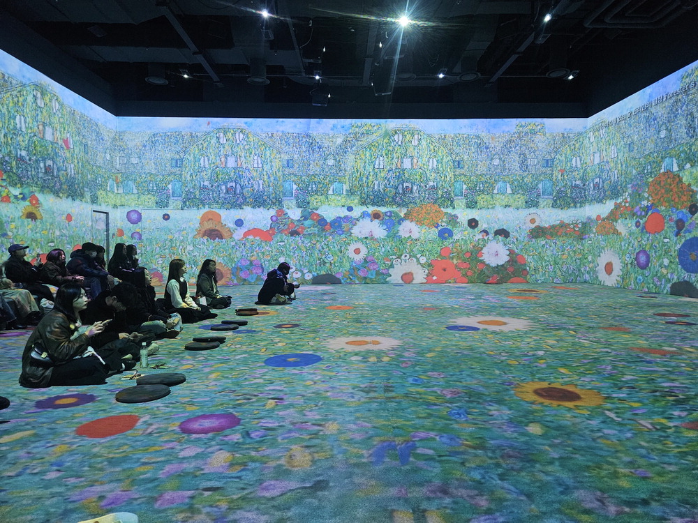 전시 기획사 미디어앤아트의 '구스타프 클림트: 타임리스 뷰티'가 열리고 있는 서울 중구 그라운드시소 명동에서 관객들이 클림트 작품을 관람하고 있다. 송경은 기자
