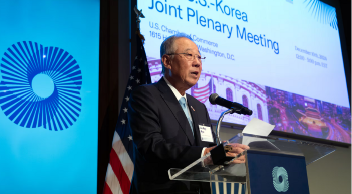 류진 한국경제인협회 회장이 지난 10일(현지시간) 미국 워싱턴DC 상공회의소에서 열린 제35차 한미재계회의 총회에서 개회사를 하고 있다. [사진 = 연합뉴스] 도널드 트럼프 미국 대통령 당선인 취임식에 우리나라 재계 인사들이 속속 초청을 받고 있다.