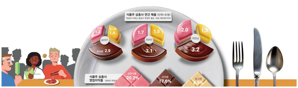 불닭볶음면(삼양식품)으로 한 끼 식사에 꼬북칩(오리온)으로 간식하고 나면 메로나(빙그레)로 입가심한다. 부지불식간 K푸드가 전 세계인의 입맛을 사로잡고 있다. 이들 식품 주식 '삼총사'는 그동안 치열하게 내수 시장에서 싸우며 경쟁력을 키우더니 이젠 수출 중심의 '성장주'로 우뚝 섰다. 올해에 이어 내년에도 사상 최고 실적을 기록할 것이란 증권가 전망이 그 대표 증거다. 최근 식품주 삼총사에 대한 실적 추정치가 상승하고 있는 것은 핵심 제품이 미국·중국·인도를 넘어 유럽 등 글로벌 식품 소비시장을 석권하고 있어서다. 여기에 계속된 한류 열풍과 최근 도드라진 달러화 강세로 원화 환산 매출이 급증하는 '승수효과'가 더해지고 있다. 최근 여의도 증권가에서 반도체나 자동차 등 전통 성장주 대신 식품주를 성장주 포트폴리오에 넣으라고 권고하는 이유다.