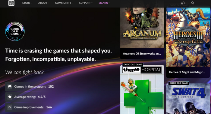 GOG의 ‘굿 올드 게임 보존’(Good old game preserved) 프로그램 홈페이지. <GOG> 게임 ‘위쳐’ 시리즈로 유명한 폴란드 게임제작사 시디 프로젝트 레드가 다운로드 플랫폼에서 사라진 ‘서버 종료(섭종)’ 게임도 이미 내려받은 게이머가 오프라인으로 계속 즐길 수 있게 하는 ‘보존 프로그램’을 본격적으로 가동한다.